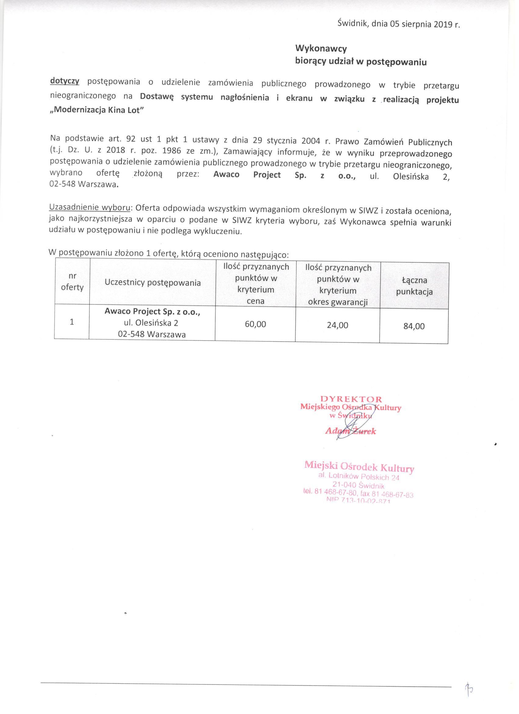 powrót do listy przetargówDostawa systemu nagłośnienia i ekranu w związku z realizacją projektu „Modernizacja Kina Lot”